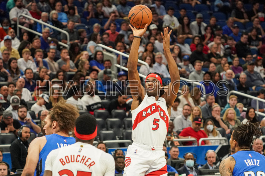 Orlando, Florida, USA, April 1, 2022, Toronto Raptors Power Forward Precious Achiuwa #5 shoots a three point shot in the first half at the Amway Center. (Photo Credit: Marty Jean-Louis)