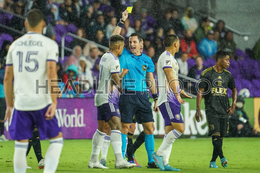 Orlando, Florida, USA, April 2, 2022, Orlando City SC player Junior Urso #11 receives a yellow card in the first half at Exploria Stadium. (Photo Credit: Marty Jean-Louis)