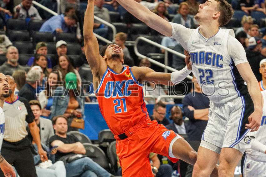 Orlando, Florida, USA, March 20, 2022, Oklahoma Thunder Shooting Guard Aaron Wiggins #21 attempt to make a basket at the Amway Center. (Photo Credit: Marty Jean-Louis)