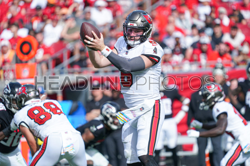 Tampa Bay, Florida, USA, October 22, 2023, Tampa Bay Buccaneers quarterback Baker Mayfield #6 readies to make a pass at Raymond James Stadium. (Photo Credit: Marty Jean-Louis)
