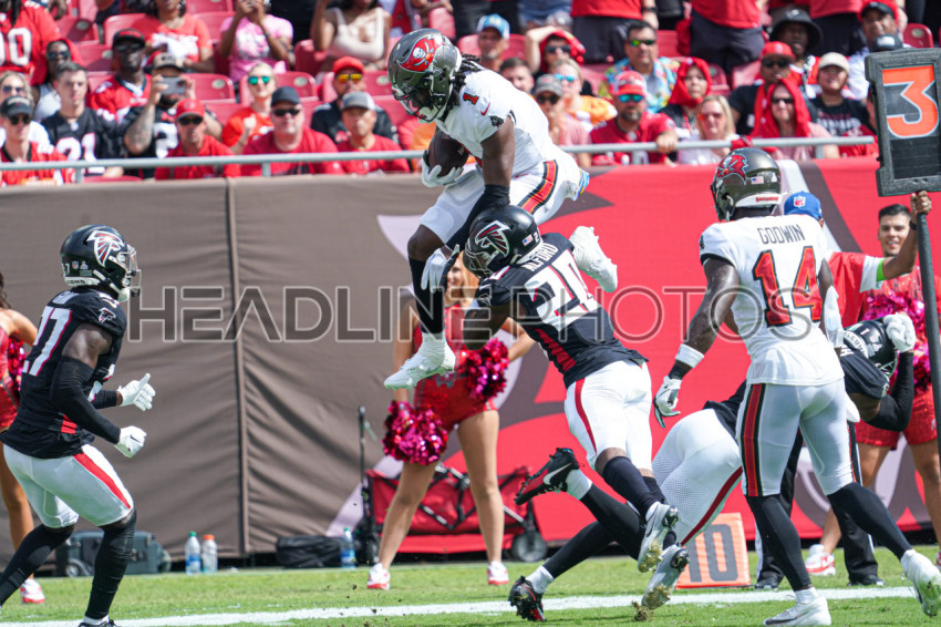 Tampa Bay, Florida, USA, October 22, 2023, Tampa Bay Buccaneers running back Rachaad White #1 attempt to jump over Falcons players during the first half at Raymond James Stadium. (Photo Credit: Marty Jean-Louis)