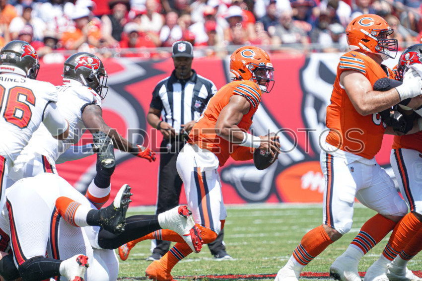 Tampa Bay, Florida, USA, September 17, 2023, Chicago Bears quarterback Justin Fields #1 on the run at Raymond James Stadium. (Photo Credit: Marty Jean-Louis)
