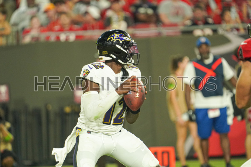 Tampa Bay, Florida, USA, August 26, 2023, Baltimore Ravens quarterback Anthony Brown #12 makes a pass at Raymond James Stadium. (Photo Credit: Marty Jean-Louis)