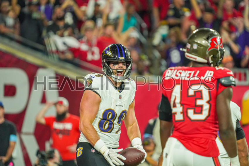 Tampa Bay, Florida, USA, August 26, 2023, Baltimore Ravens Tight End Charlie Kolar #88 makes a run in the first quarter at Raymond James Stadium. (Photo Credit: Marty Jean-Louis)