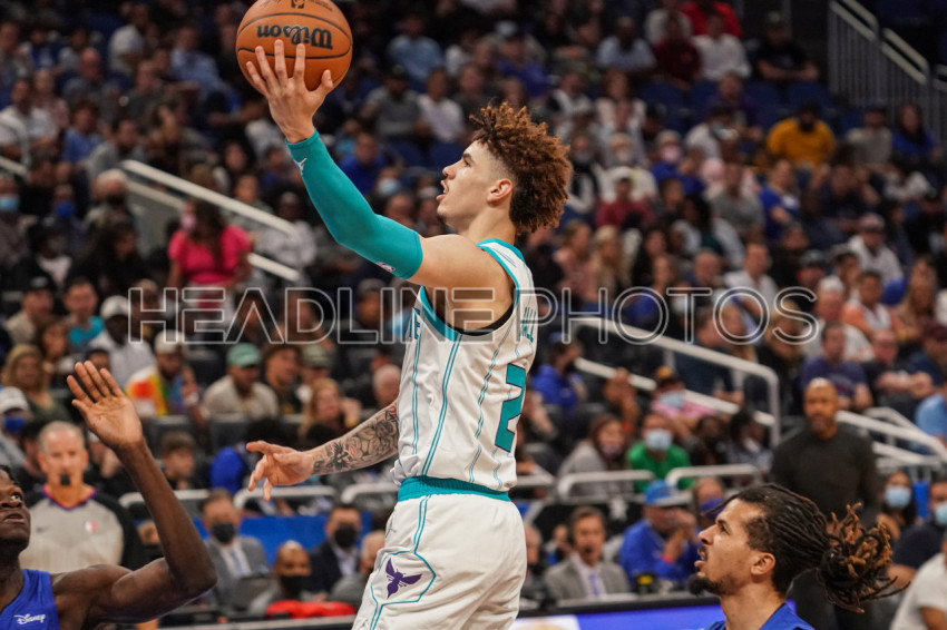 Orlando, Florida, USA, October 27, 2021, Charlotte Hornests Guard LaMelo Ball #2 attempt to make a basket at the Amway Center. (Photo Credit: Marty Jean-Louis)
