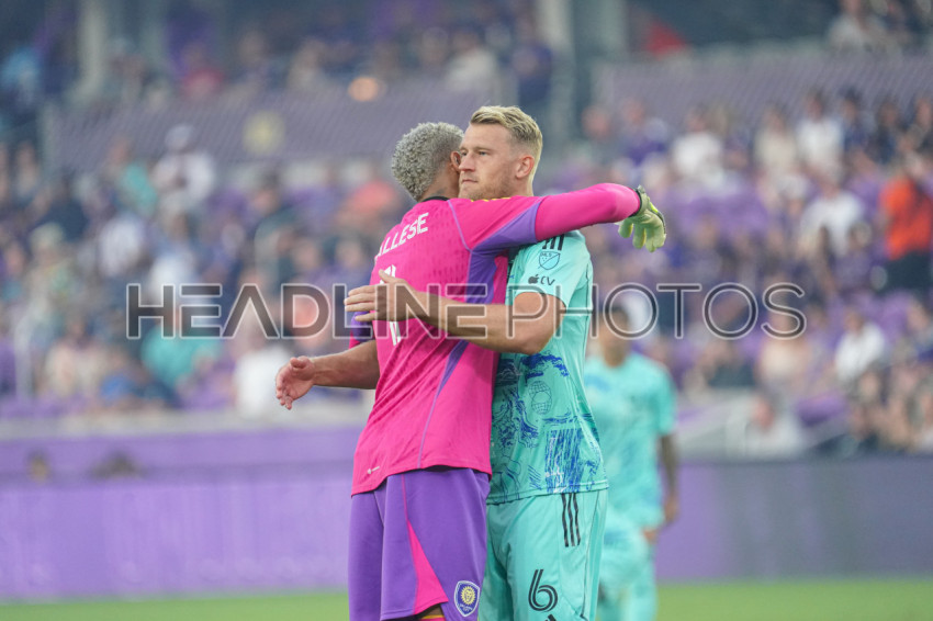 Orlando, Florida, USA, April 22, 2023, Orlando City SC goalkeeper Pedro Gallese #1 and Defender Robin Jansson #6 share a hug at Exploria Stadium. (Photo Credit: Marty Jean-Louis)