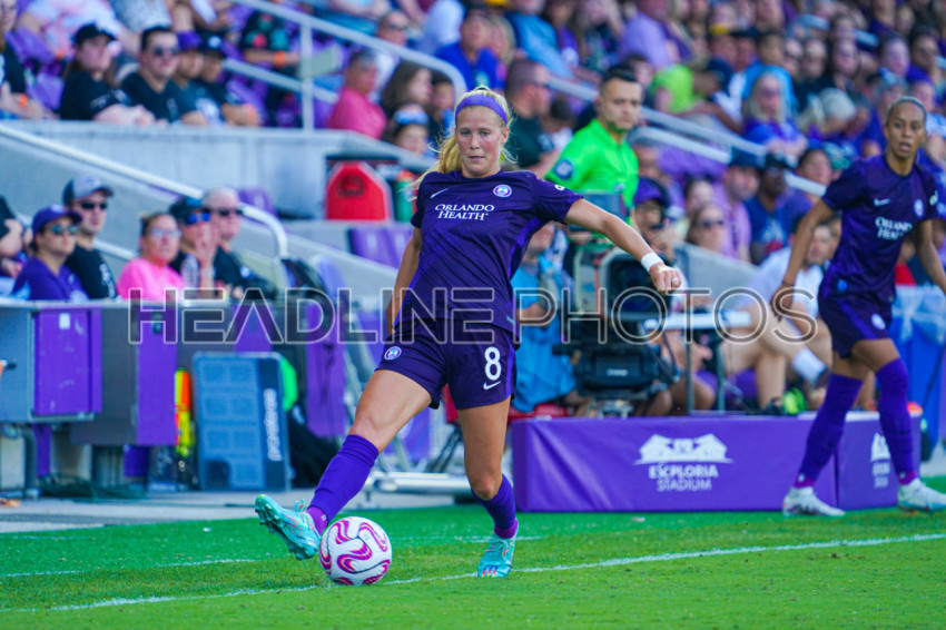Orlando, Florida, USA, April 2, 2023, Orlando Pride player Mikayla Cluff #8 saves the ball from going out in the first half at Exploria Stadium. (Photo Credit: Marty Jean-Louis)