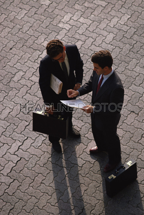 Man handing over briefcase to another man in business suit