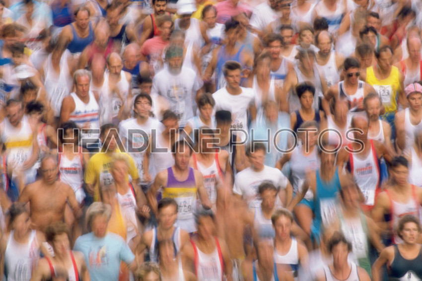 Wide shot large crowd of people running in marathon toward camera on city stree
